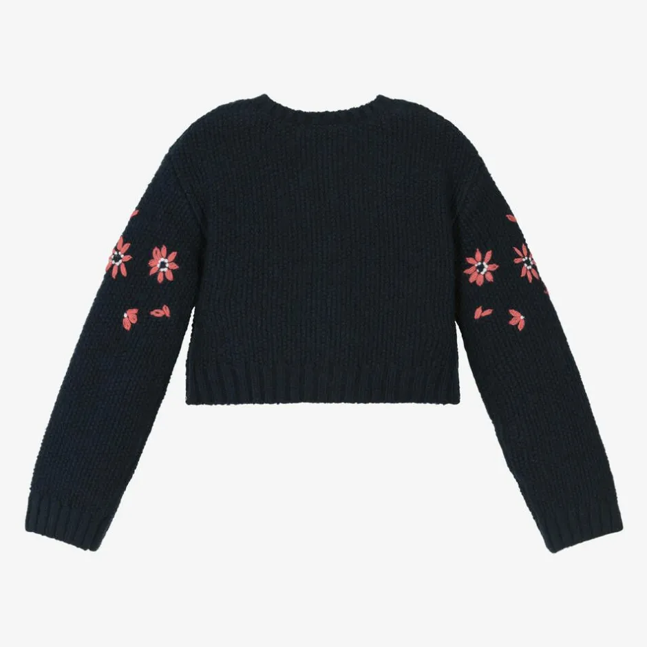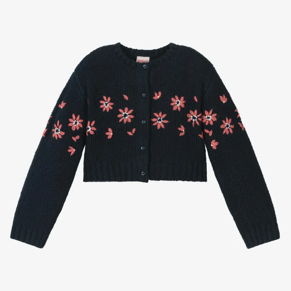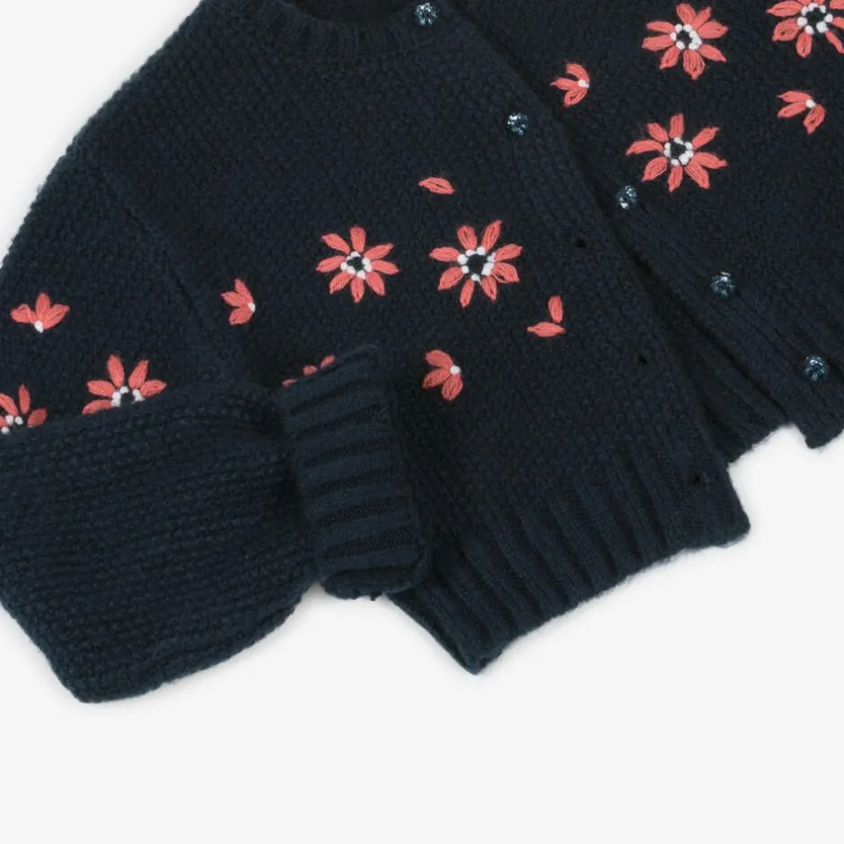 Cute navy blue cardigan for younger girls by Boboli, with embroidered pink flowers. Softly knitted with a touch of cosy wool, this crew neck style has a lovely moss stitch pattern, classic ribbed trims and sparkly button fastenings.