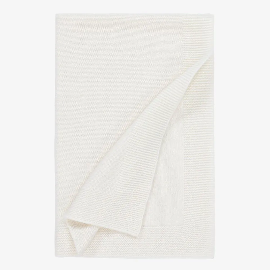 Gorgeous ivory blanket for baby boys and girls by French brand Bonpoint, knitted in luxuriously soft cashmere. It has a contrast garter stitch border and the brand's signature cherry motif is patterned at the centre.