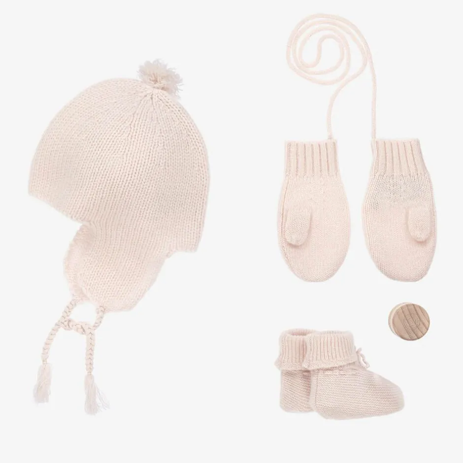 Adorable pink knitted cashmere set for baby boys and girls by luxury French brand, Bonpoint. Ideal as a gift, this super soft set comprises mittens, booties and a cosy hat with a pom-pom, ear flaps and braided ties to secure under the chin. Also included is a charming wooden box for milk teeth and the set comes beautifully presented in a box.