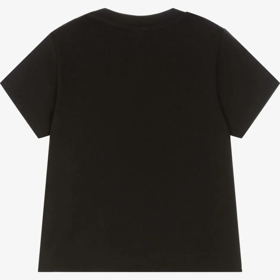 Black T-shirt for baby boys from BOSS, made in soft cotton jersey. This cool and casual wardrobe staple has a large white logo printed on the chest. There are popper fastenings on one shoulder for stress-free dressing.