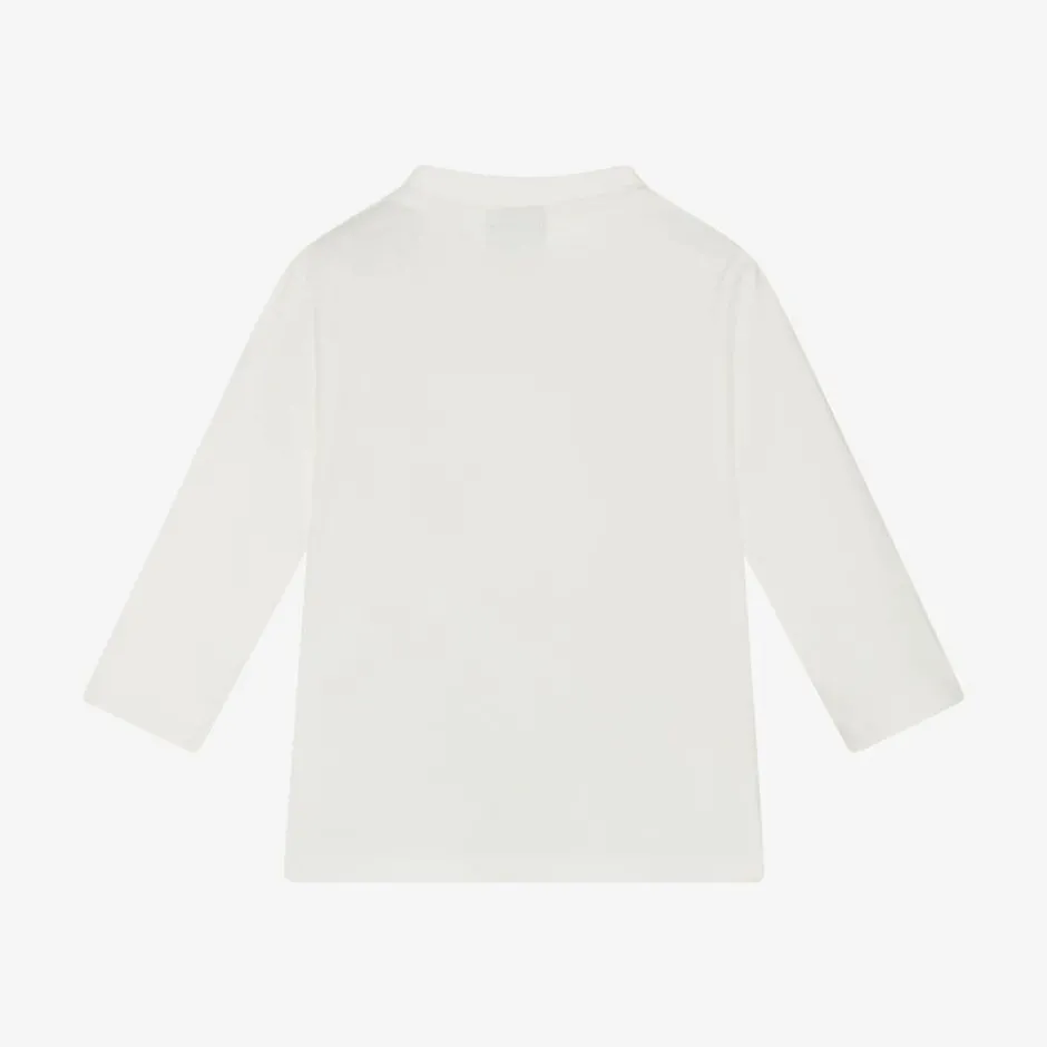 White long-sleeved top for baby boys by BOSS, made in soft and stretchy organic cotton jersey. Comfortable against delicate skin, this casual top has a logo printed across the front in the brand's signature colours and useful branded poppers on one shoulder to help with dressing.
