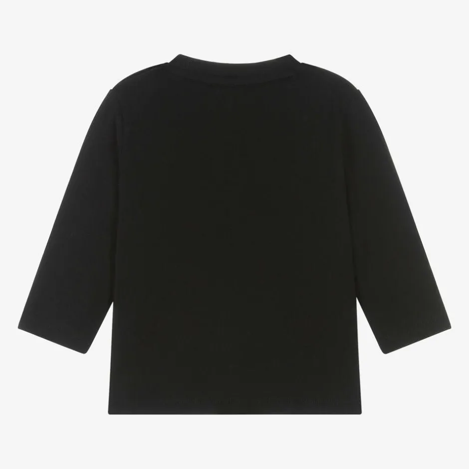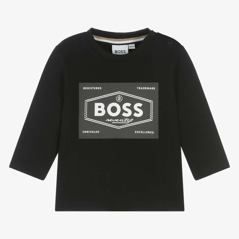 A black long-sleeved top for little boys by BOSS, made in soft cotton jersey. Fastening with poppers on one shoulder, this casual style has The Original BOSS 1977 logo on the front. The neckline is lightly ribbed for comfortable, easy dressing.