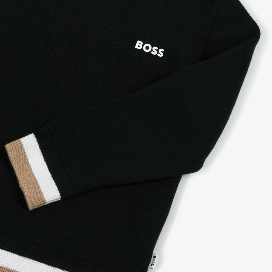 A stylish black jumper for boys by BOSS, knitted in a soft cotton and wool blend. This classic crew neck style features the brand's signature stripes in beige, white and black, with a white logo print on the chest and a branded tab on the side seam.