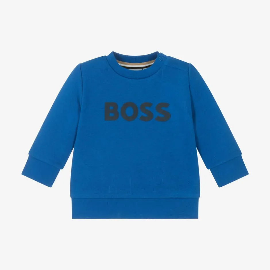 Bright blue cotton sweatshirt for little boys by BOSS, made in soft mid-weight jersey with a cosy fleece feel inside. This casual, long-sleeved top has gently ribbed trims and easy popper fastenings on one shoulder to help with dressing. There is a rubberised navy blue logo printed on the front for a distinctive designer touch.