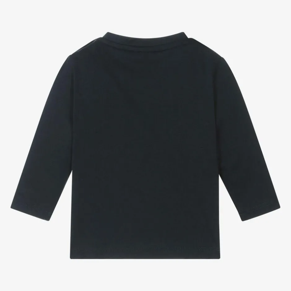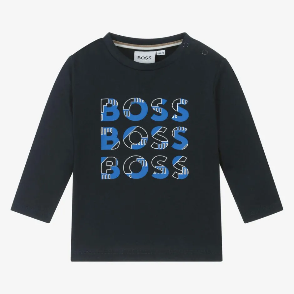 Navy blue long-sleeved top for little boys by BOSS, made in soft cotton jersey. Comfortable against delicate skin, this slim-fitting top has a trio of blue and white logos printed on the front and branded popper fastenings on one shoulder for easy dressing.