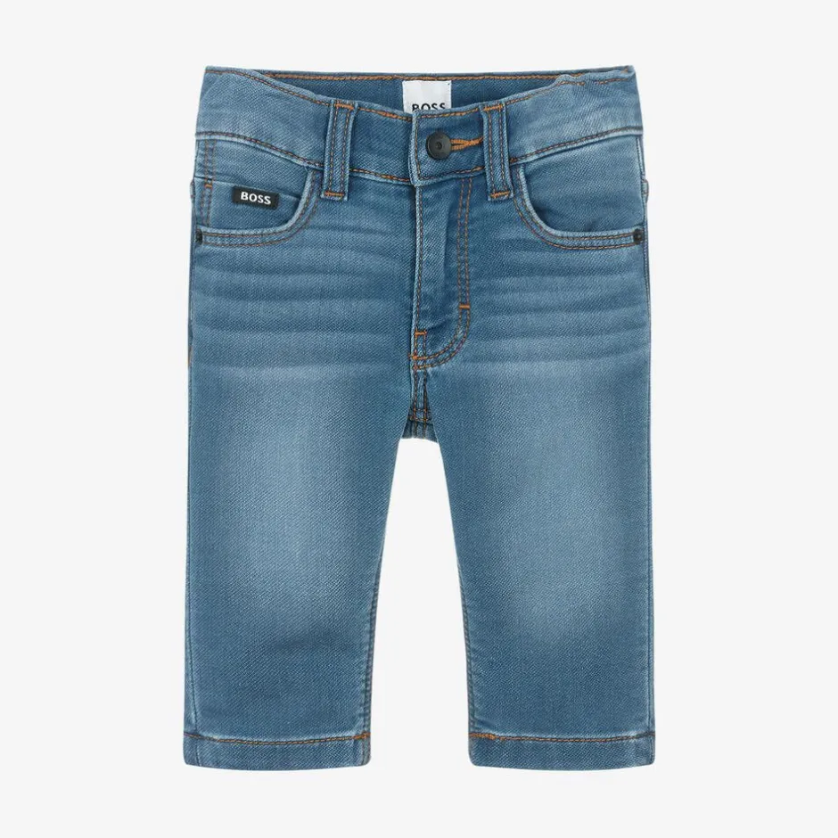 In a mid-blue wash, these stylish jeans for younger boys by BOSS are made in soft cotton-blend denim, with a hint of stretch. Designed in a regular fit, they have classic five-pocket styling, with a small logo tab on the front and a branded jacron on the back. They fasten with a hook and zip and have an adjustable waistband to ensure a comfortable fit.