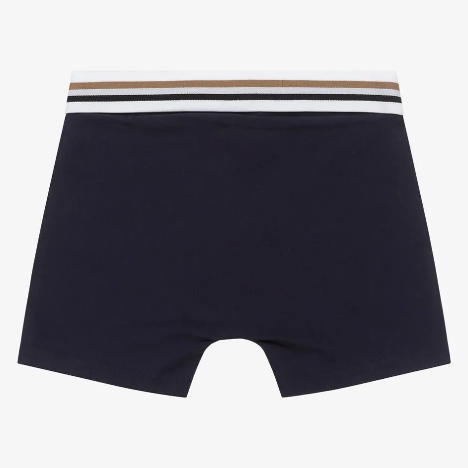 Pack of two, Mini-me boxer shorts for boys by BOSS, in navy blue and grey colourways. Made in soft and stretchy cotton jersey, they have comfortable, elasticated waistbands, woven with the brand's iconic striped trim and logo for a distinctive look.