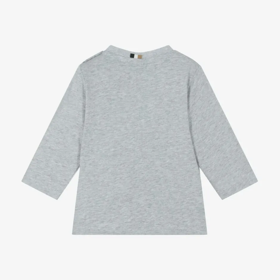 Grey marl long-sleeved top for little boys by BOSS, with a bold blue logo printed on the front. Ideal for layering, this casual wardrobe essential is made in soft cotton jersey with a lightly ribbed crew neck. Popper fastenings on one shoulder help with over-the-head dressing.
