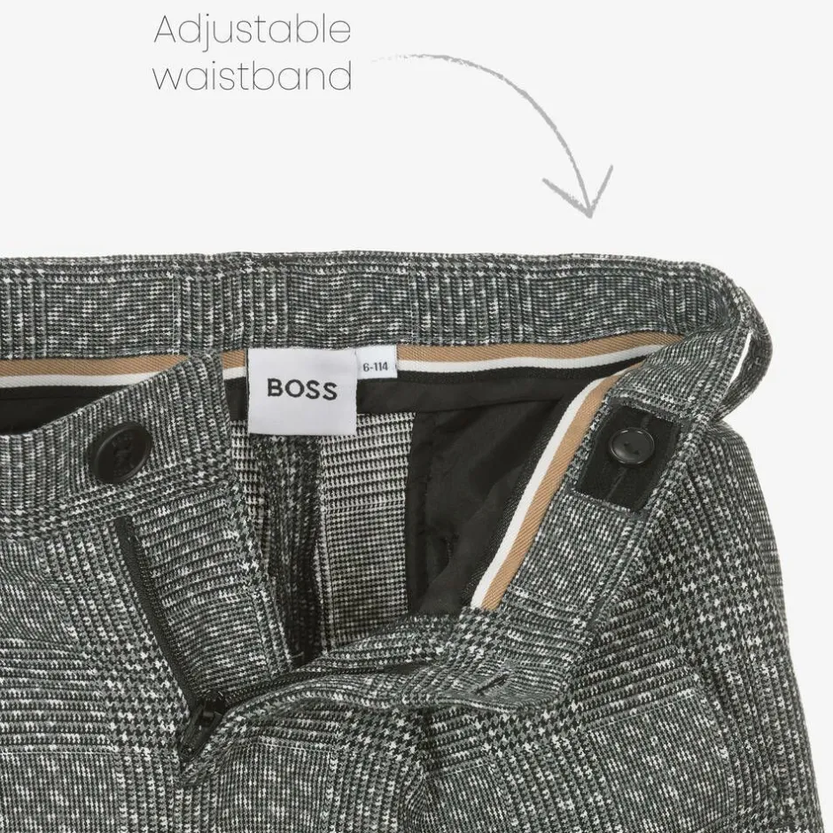 Grey Mini-me suit for boys by BOSS, made in a luxurious viscose blend fabric. Beautifully tailored for a special occasion, it is patterned with a smart Prince of Wales check, overlaid with the brand's Double B monogram logos for an eye-catching designer effect. The double-breasted jacket has faux front pockets, a notch collar and The Original Boss 1977 logo patch on one sleeve. The matching trousers have pleats on the front, slanted pockets and faux pockets on the back. They fasten with a button and zip and have a useful adjustable waist for a great fit.
