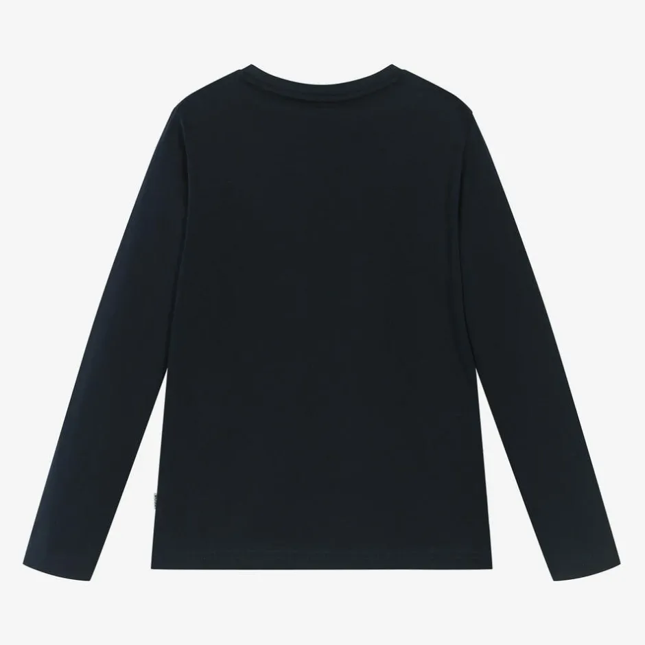Navy blue top for boys from BOSS, made from cotton and designed in a slim-fitting style. The soft jersey fabric provides comfort and the blue futuristic graphic on the chest adds brand appeal. This long-sleeved top has a logo tab on the side to complete the look.