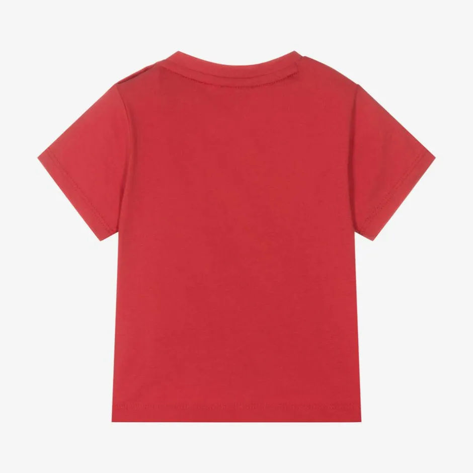 Red cotton T-shirt for little boys by BOSS, made in comfortable jersey. For instant designer appeal, it has a bold white logo print across the chest. This casual wardrobe staple has a ribbed crew neck, short sleeves and popper fastenings on one shoulder to help with dressing.