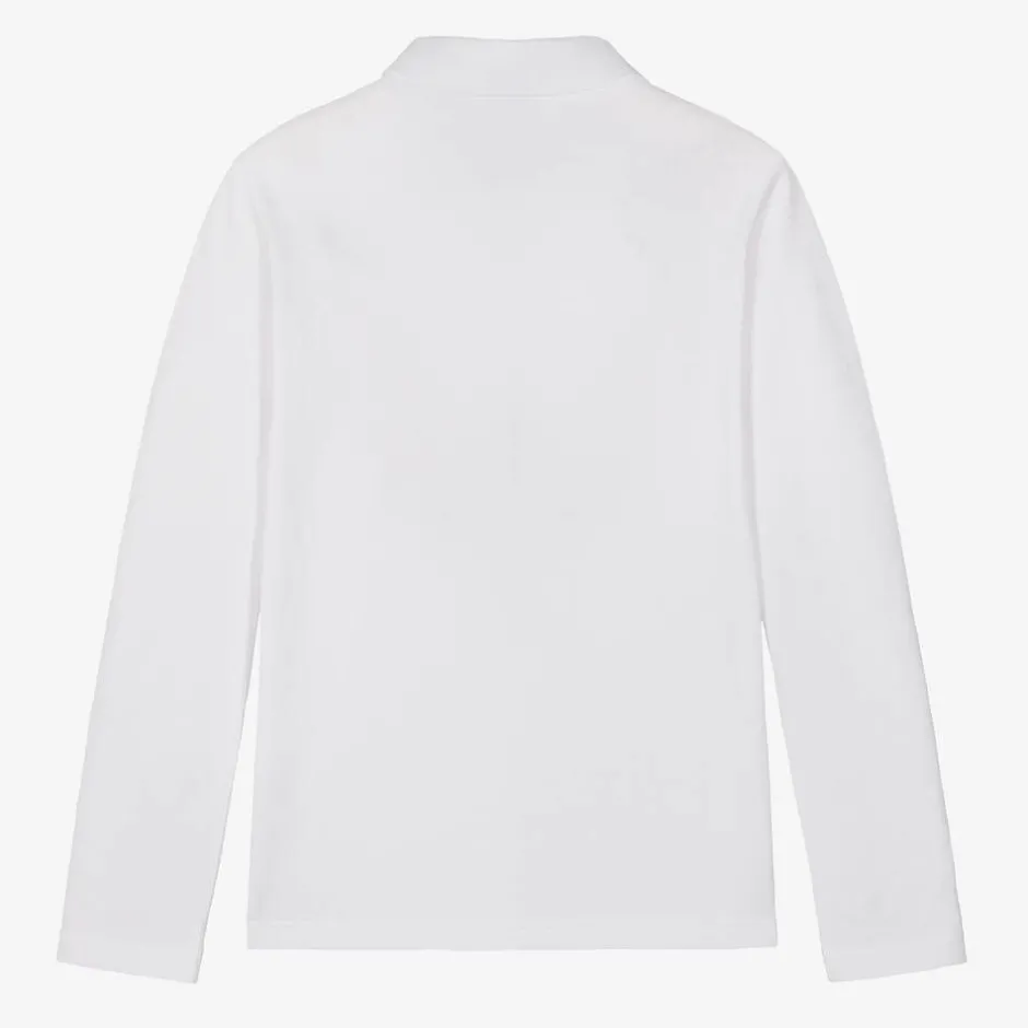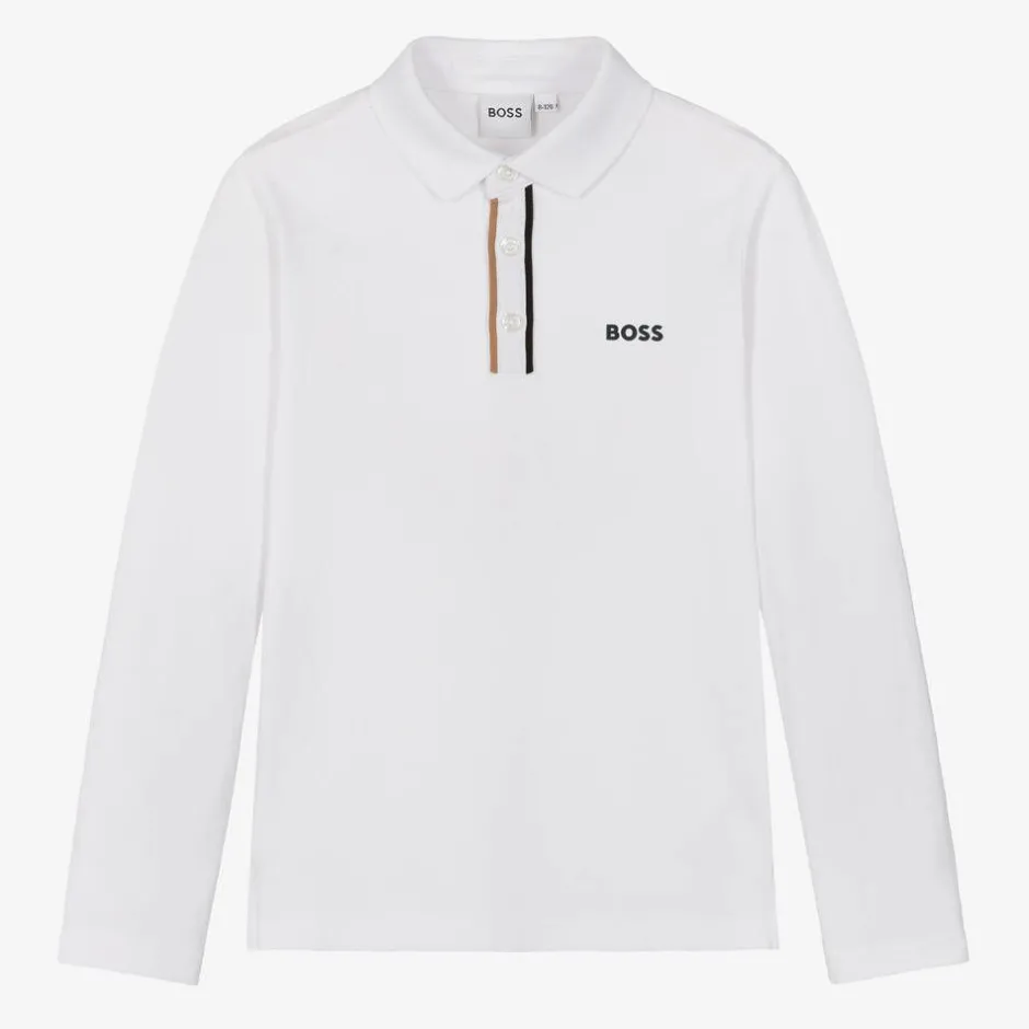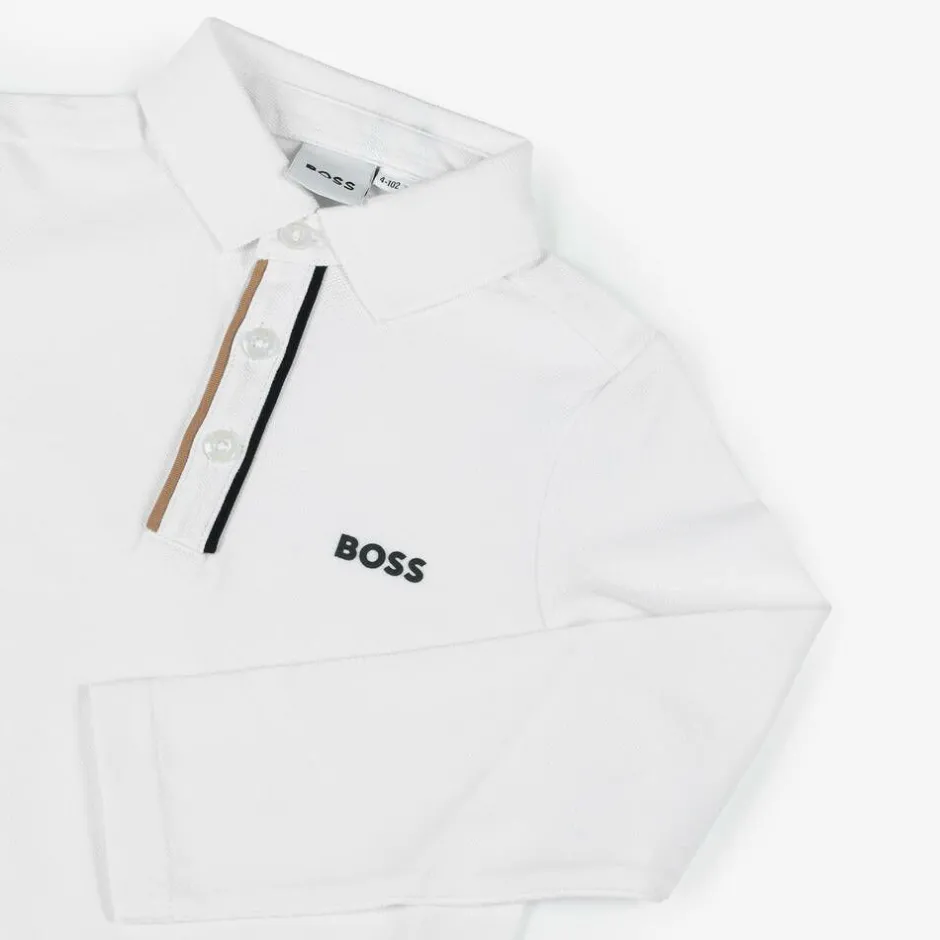 Long-sleeved white cotton polo shirt for boys by BOSS, with a black rubberised logo on the chest. Cool and comfortable, this piqué top has button fastenings on the front, with beige and black trims for a subtle designer finish.