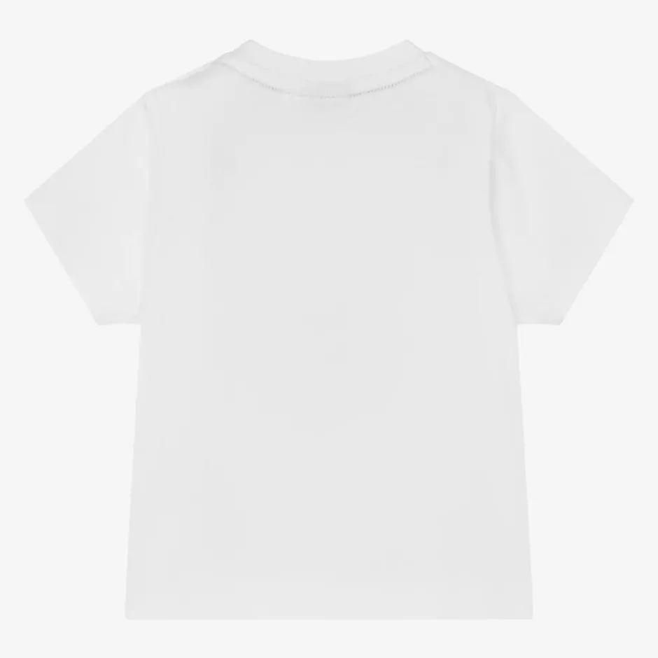 A fun white T-shirt for little boys by BOSS, featuring a smart bear in a suit, with the words 'My first suit'. Made in soft and comfortable jersey, it has short sleeves and a gently ribbed crew neck, with popper fastenings on one shoulder.