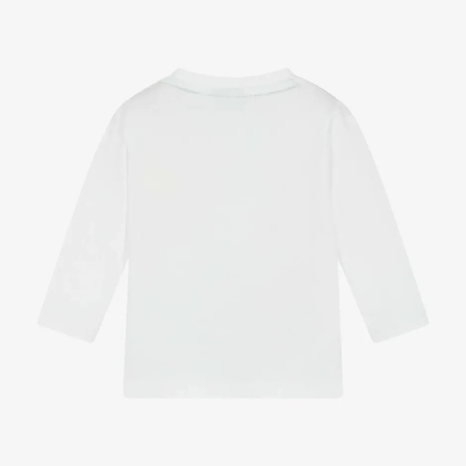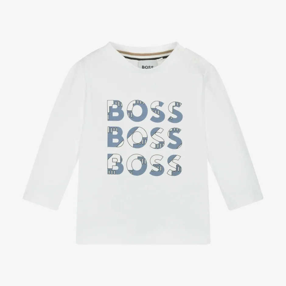White long-sleeved top for little boys by BOSS, made in soft cotton jersey. Comfortable against delicate skin, this slim-fitting top has a trio of blue and white logos printed on the front and branded popper fastenings on one shoulder for easy dressing.