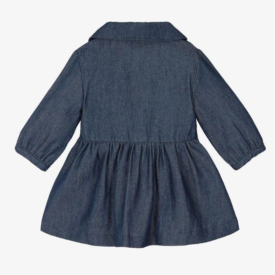Cute navy blue denim dress for little girls by German designer BOSS. Made in lightweight cotton, it has popper-fastening flap pockets on the front, one with navy blue logo embroidery. With long sleeves and a full, gathered skirt, it fastens with branded pink poppers.