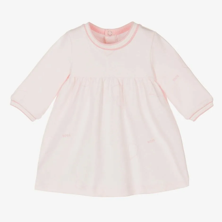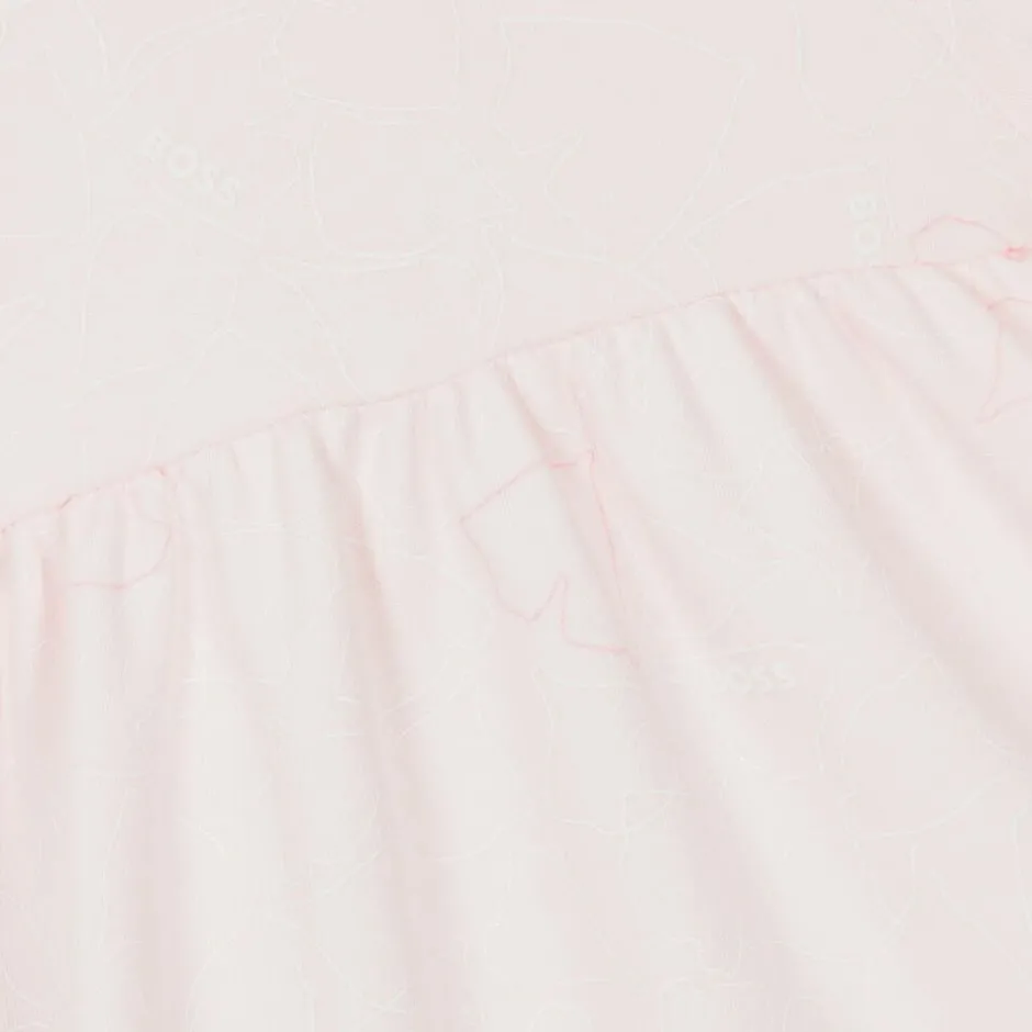 Cute and comfortable, a pale pink organic cotton dress for little girls by German designer BOSS, with a contrasting pink and white pattern of ginkgo leaves and logos. It has ribbed trims striped in shades of pink and a full, gathered skirt. There are branded popper fastenings on the back to assist with dressing.