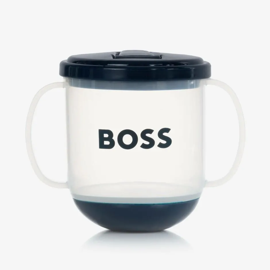 Navy blue sippy cup for boys and girls by BOSS, designed for little ones six months and up. BPA free, it has a removable lid for easy cleaning and a weighted base so it stays upright. The fold-down spout prevents unwanted spillages and it has two easy-to-hold handles. The brand's instantly recognisable logo is printed on the front in navy blue for a logo-inspired finish.