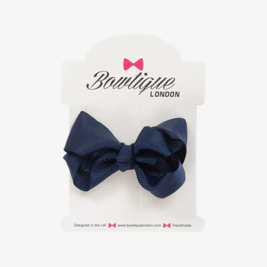 Sweet navy blue bow hair clip for girls from Bowtique London. A lovely accessory to complete an outfit, it is handmade in soft grosgrain ribbon and set on a slide-in metal clip.