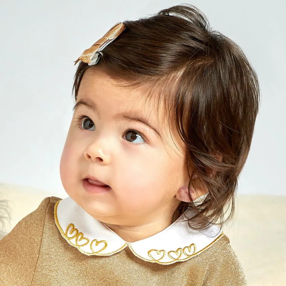 Two lovely hair clips for girls by Bowtique London, decorated with glittery gold ribbon bows. Set on a metal clip, they are easy to slide to keep hair in place.