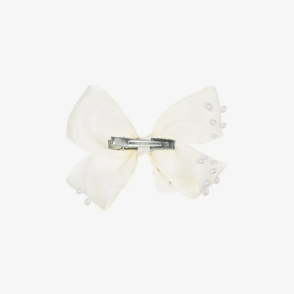 A pretty ivory grosgrain bow hairclip for girls by Bowtique London, decorated with scattered faux pearls. It is attached to a metal crocodile clip.