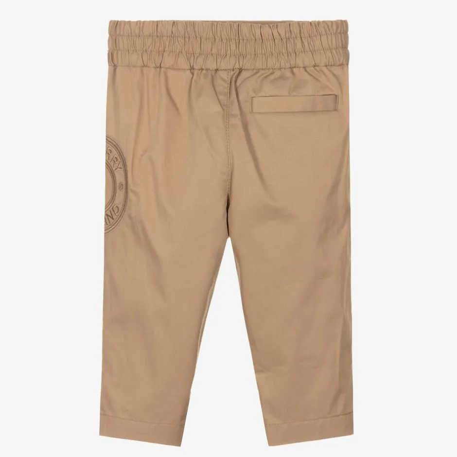 Smart-casual beige trousers for baby boys by luxury British brand, Burberry. Made in fine cotton twill, these comfortable chino trousers have a tonal embroidered logo design on one leg and a pocket on the back. The waistband is elasticated for easy pull-on.