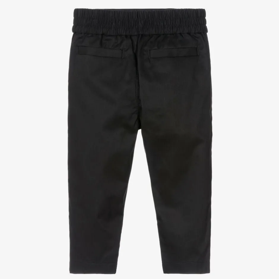 Black cotton trousers for baby boys by luxury designer Burberry. Smart-casual in soft twill, these comfortable chino trousers have a tonal Equestrian Knight Design embroidered on the leg which is a significant symbol of the British brand's heritage. They have side and back pockets, along with an elasticated waistband for ease of wear.