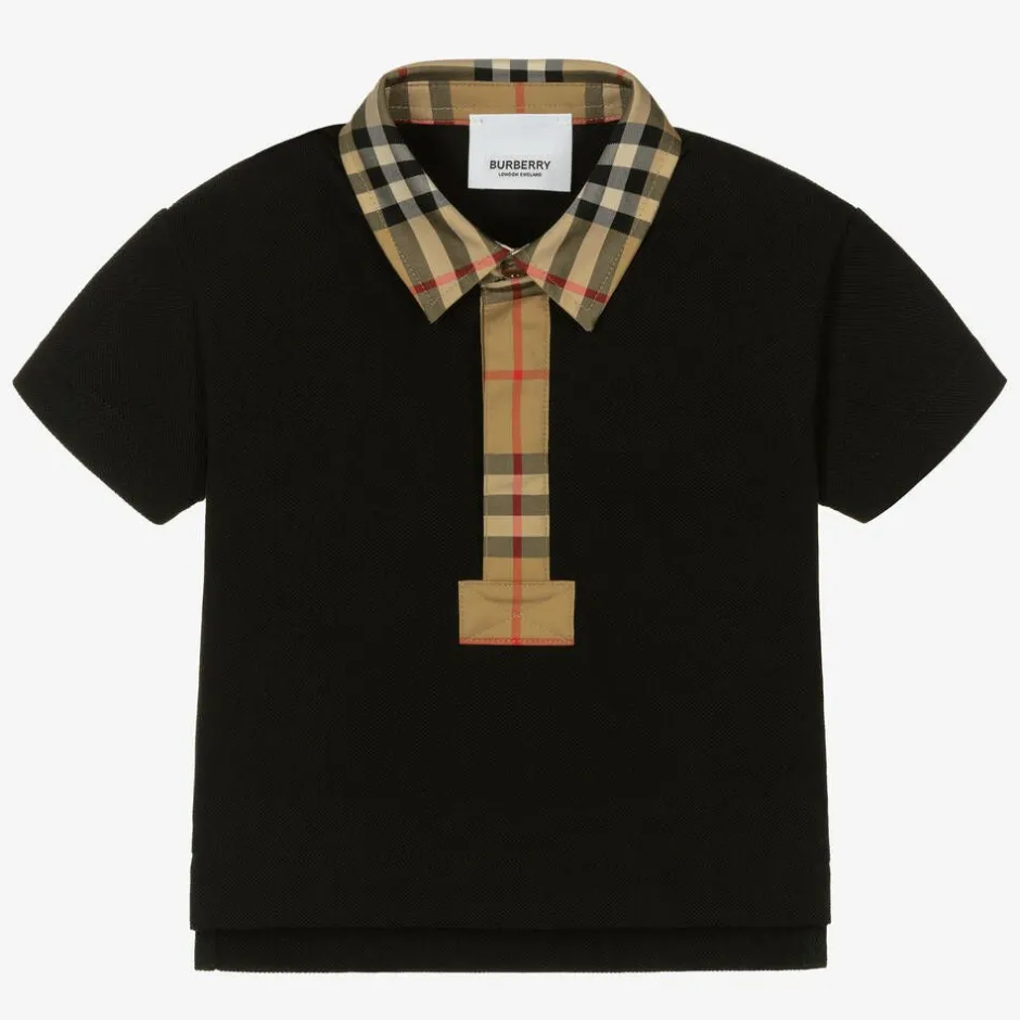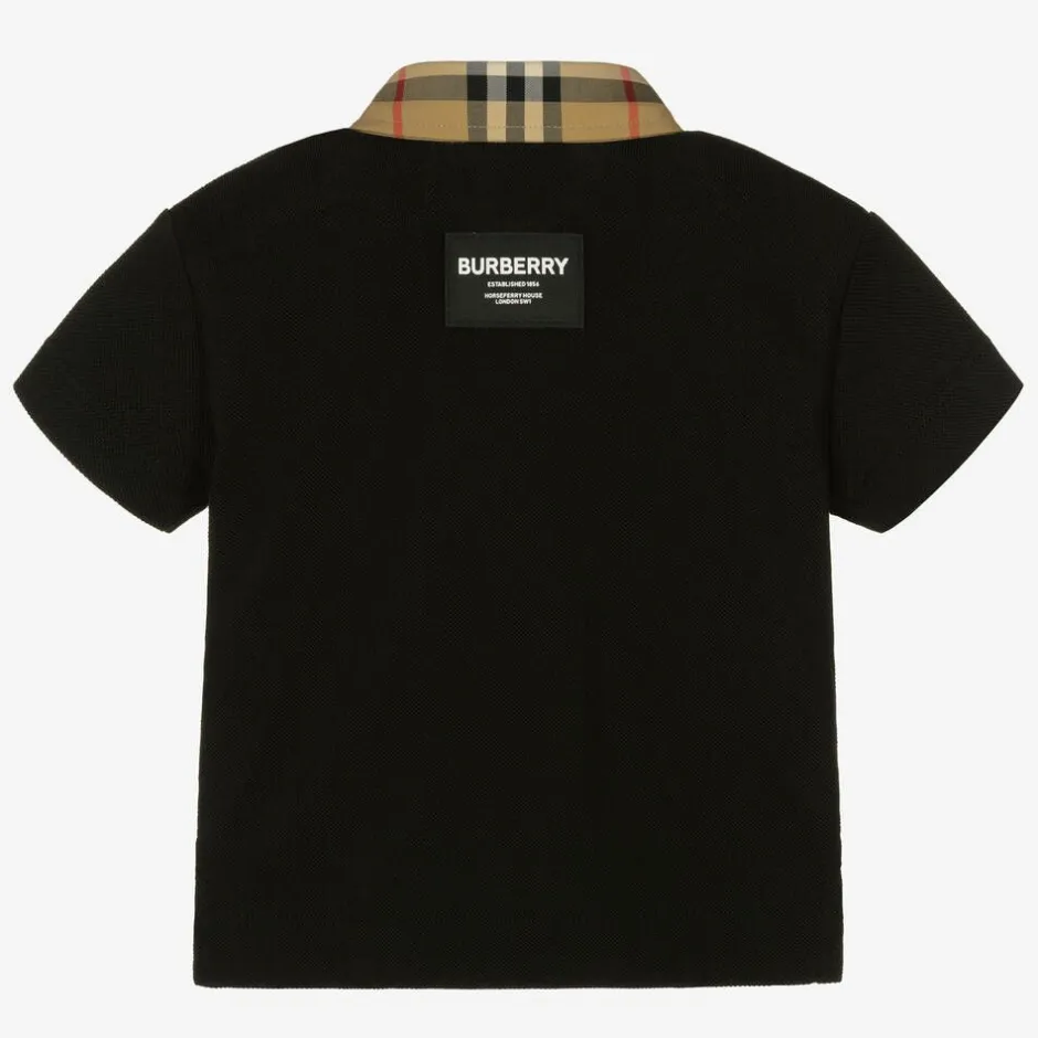 Black polo shirt for baby boys by luxury British brand Burberry, with the signature beige Vintage check trims. Smart casual, it is made in comfortable cotton piqué, with faux tortoiseshell logo button fastening on the placket. The hemline is slightly longer at the back and there is a black rubberised badge with a statement white Horseferry logo.