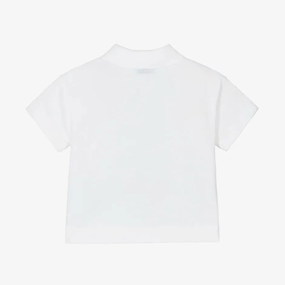 From British luxury label Burberry, a classic polo shirt for baby boys in white. It is made in soft cotton piqué with a ribbed collar and button fastenings. For designer appeal, the brand's Equestrian Knight Design is embroidered in beige on the chest and the signature beige check is concealed beneath the button placket.