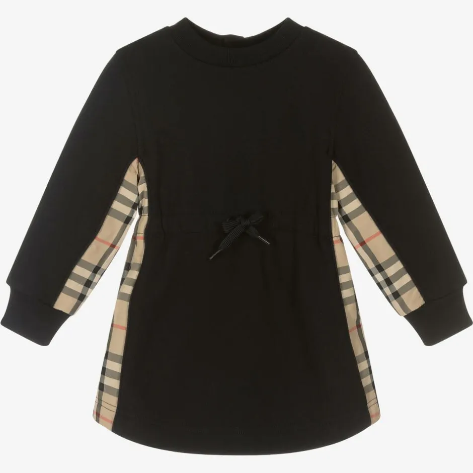 Cool black dress for baby girls from luxury British brand Burberry, made in mid-weight cotton jersey. Instantly recognisable, it has beige Vintage check trims on the sides. It fastens with buttons on the back and has an elasticated drawstring waist for a pretty shape.