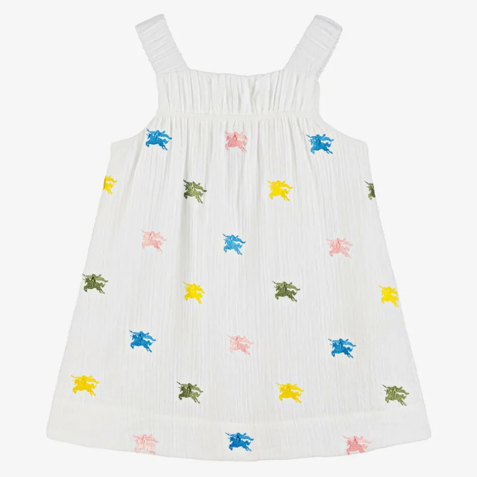 A lightweight muslin dress in ivory for girls by luxury fashion house Burberry, made and lined in soft, gentle-on-the-skin cotton. Accented by blue, yellow, pink and green, this sleeveless design is decorated with the British label's distinctive Equestrian Knight Design logo embroidery. The shoulder straps and back panel are elasticated for long-lasting comfort and simple dressing. A matching pair of embroidered, frilled cotton knickers complete the coordinated look.