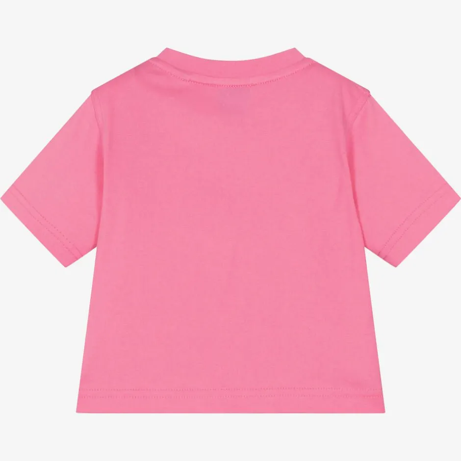 Bright pink cotton T-shirt for baby girls by British luxury brand Burberry, designed for casual days. The front is printed with an archival beige Horseferry logo print for instant designer appeal. It fastens with pink button fastenings on one shoulder for cute style. This product contains organic cotton.