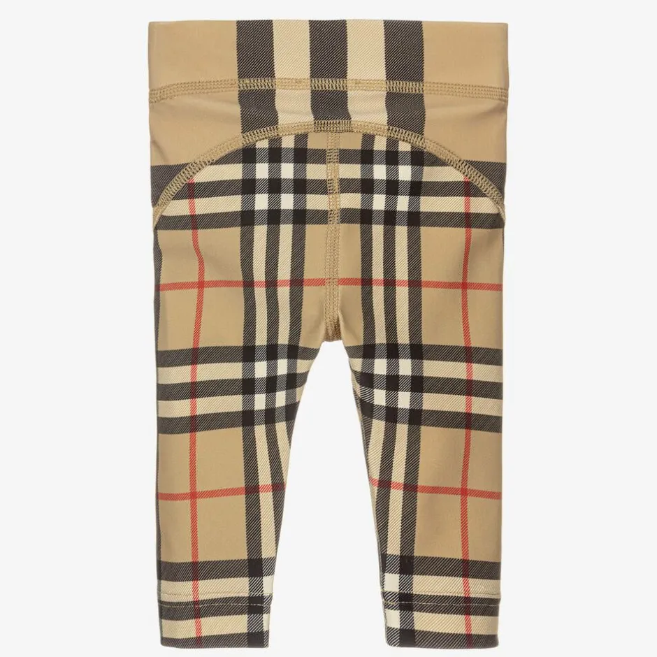 Baby girls beige check leggings by British luxury brand Burberry, suitable for swimming. They are patterned with the brand's oversized check on the front and have Vintage check panelling on the back for the distinctive Burberry look. Stylish and comfortable for the pool and beyond, they super smooth and stretchy with a wide elasticated waistband for a quick pull-on. The main material of this product is made with at least 70% recycled content.