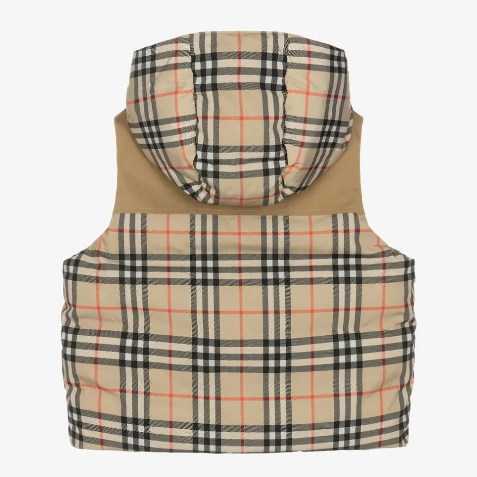 Archive beige reversible puffer gilet for boys from British designer Burberry. Made in silky and smooth fabric, it is padded with luxurious down for supreme warmth. One side is plain beige, with the British label's Horseferry logo patch and the iconic Vintage check pattern on the hood lining. The reverse is designed with beige canvas and silky Vintage check panels in the signature beige, red and black colour palette. Both sides have popper-fastening pockets and a gold statement branded zip fastening.