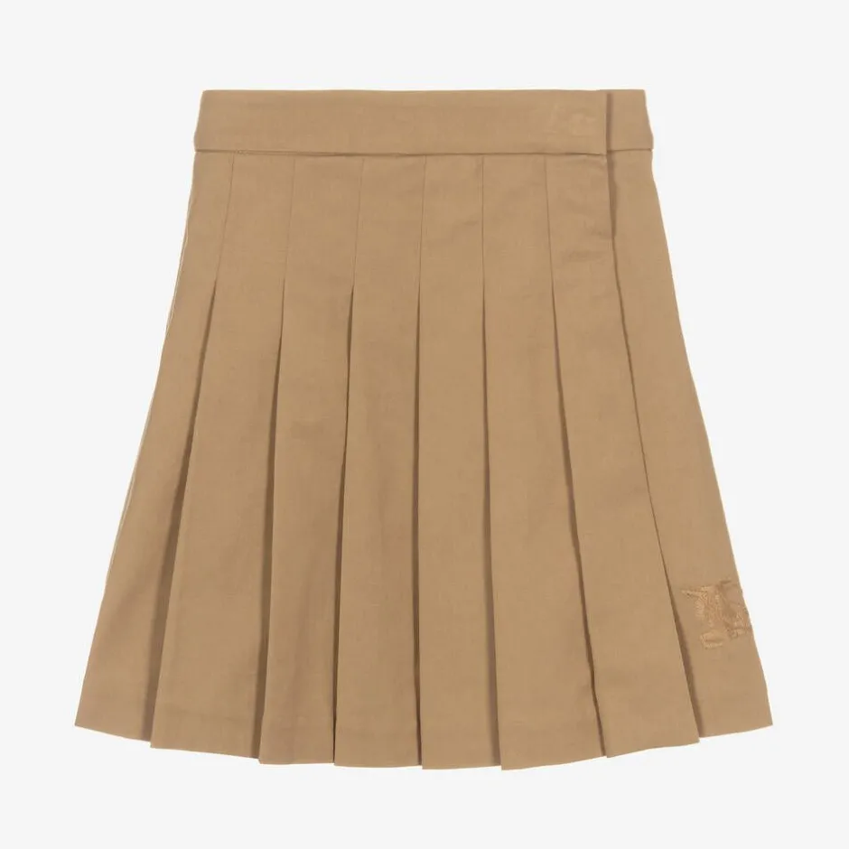 Smart beige skirt for girls by luxury brand Burberry, woven in a soft cotton-blend twill. This pleated style secures with a button and hook on the front, and is embroidered with the iconic Equestrian Knight Design on one side. Lined in silky satin, it has an adjustable waist for an ideal fit.