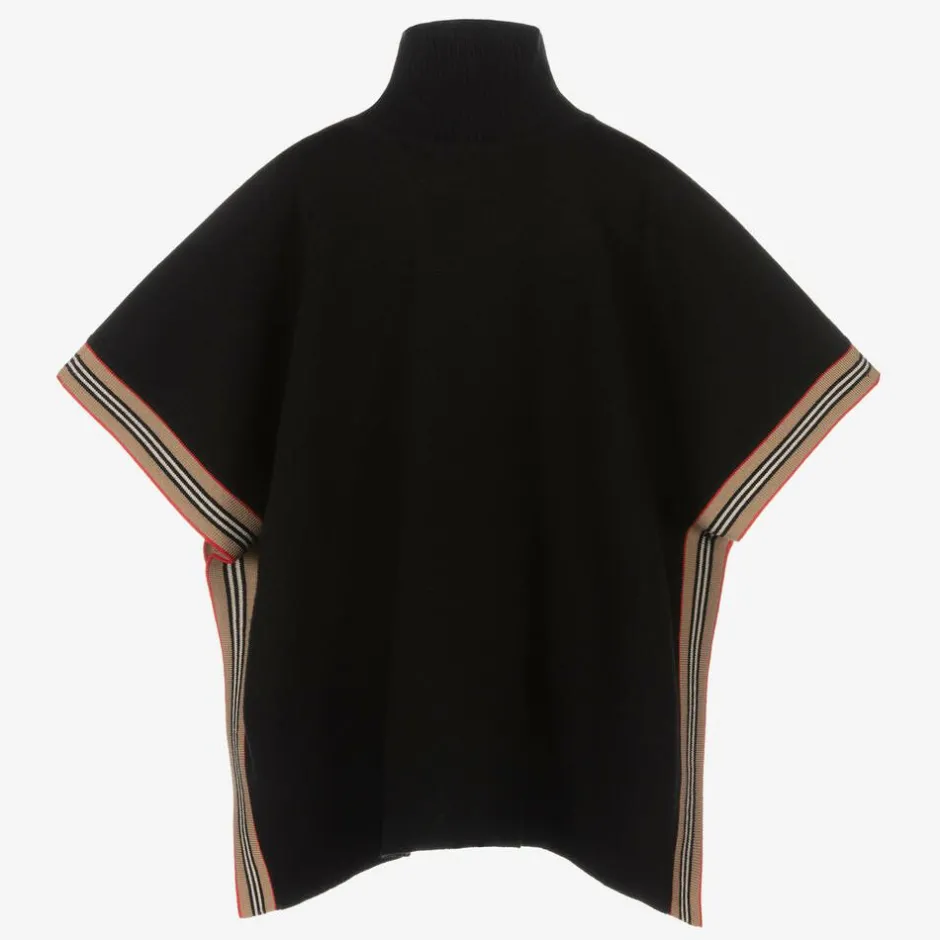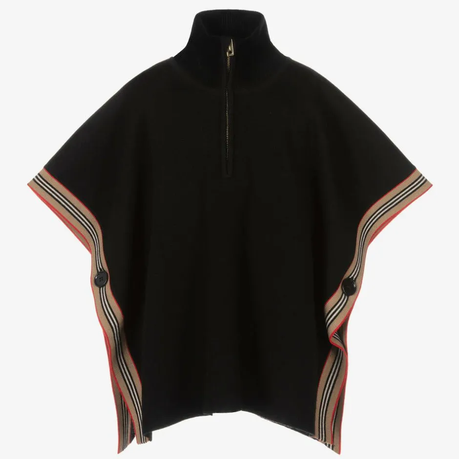 Beautiful black cape for girls by luxury British brand Burberry, with the designer's beige micro Icon stripe trims. Knitted in fine, responsibly sourced Merino wool, it has a cosy ribbed turtle neck and fastens with a logo-embossed half zip on the front in gold. There are useful logo button fastenings on the sides to create stylish armholes.