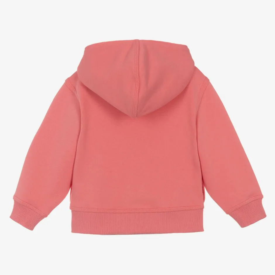 A long-sleeved hoodie for girls by luxury British brand Burberry, in a bold coral pink shade. Fastening with a silver-tone zip on the front, it is stitched with a tonal frayed-edged Equestrian Knight Design patch on the chest for a branded finish. Made from soft mid-weight cotton jersey, it has ribbed trims to enhance the casual style. This product contains organic cotton.