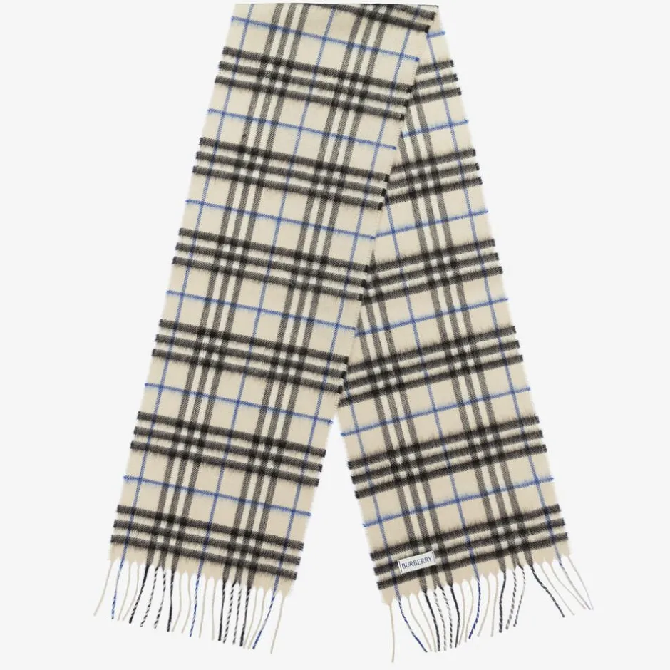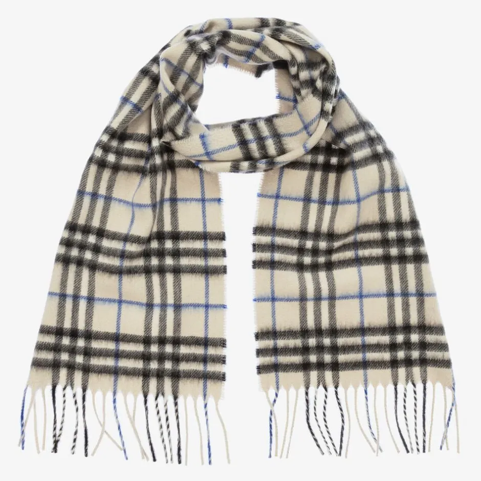 Designed by luxury brand Burberry, this light grey-beige cashmere scarf for boys and girls is ideal for adding a designer accessory to colder days. Woven at a 200 year old Scottish mill using traditional looms, this beautifully soft scarf is made in their iconic Burberry Check with Knight blue stripes for a modern yet heritage look.