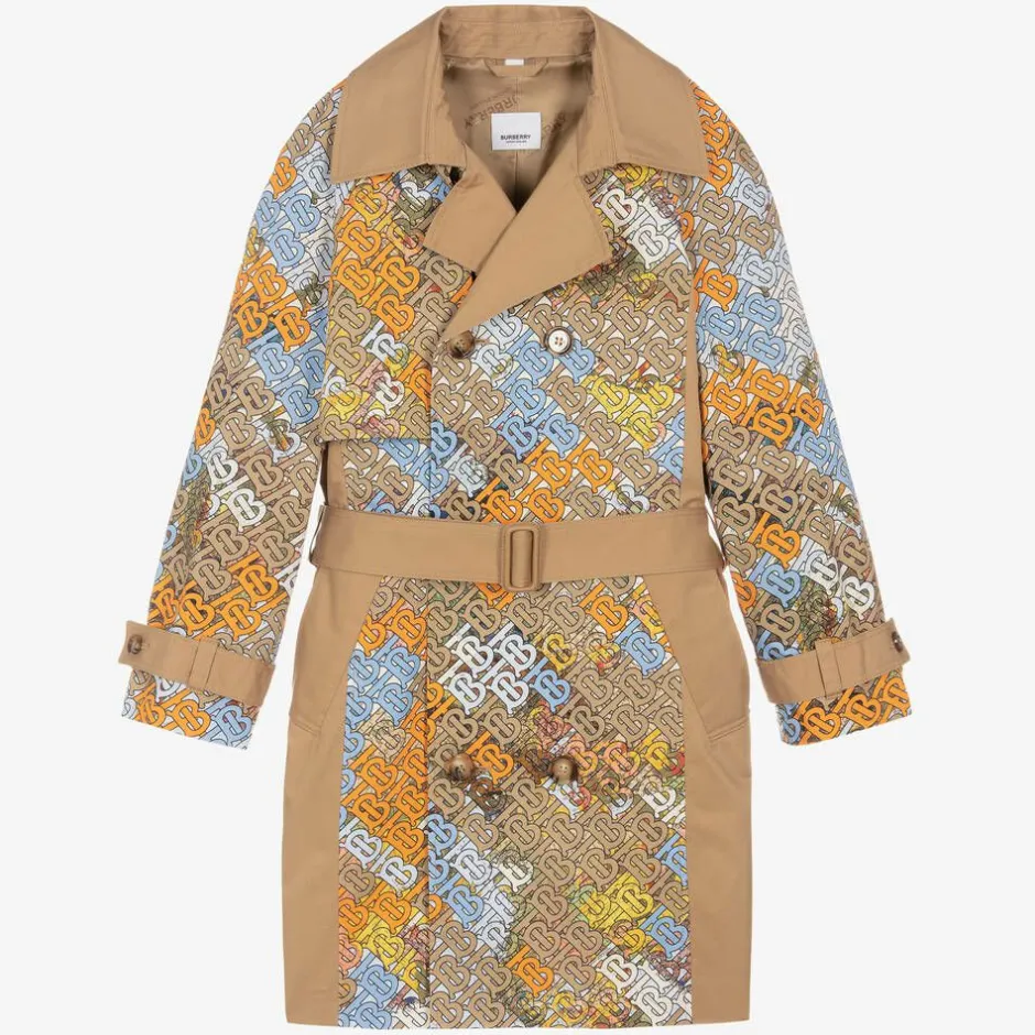 Luxury trench coat for teen boys and girls by British brand, Burberry. It is made in soft cotton gabardine fabric, enhanced by eye-catching Monogram prints in shades of beige, orange and blue, with map accents. Traditional features include double-breasted button fastenings, gun flap, belted cuffs and a storm shield. It is lined in silky cupro with a Burberry logo jacquard weave. Useful side pockets and a belt complete this contemporary twist on a classic design.