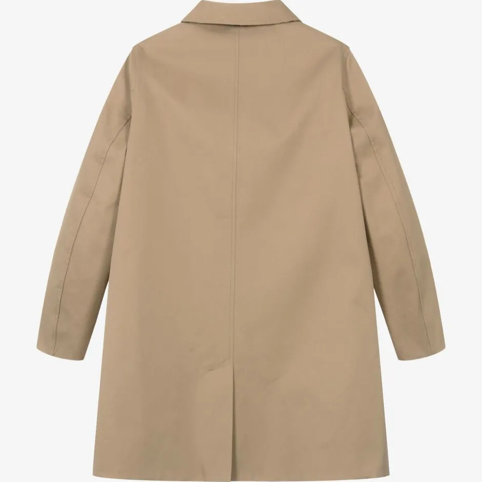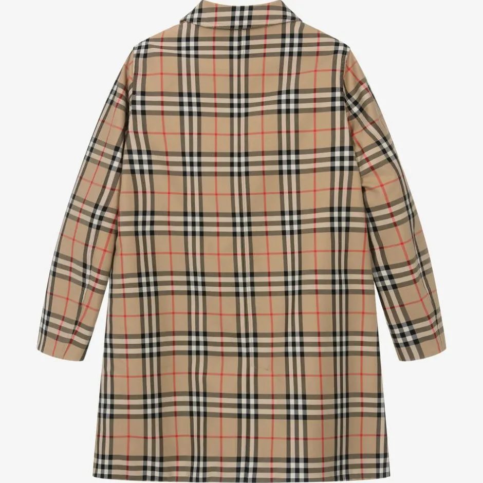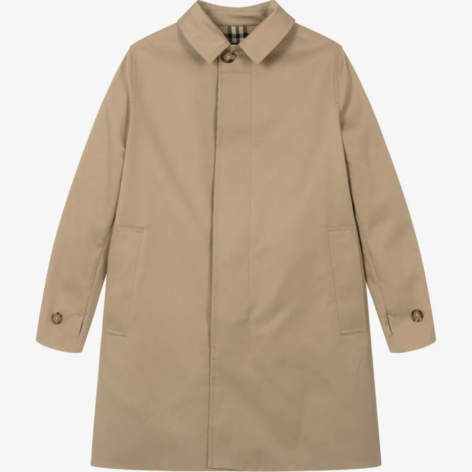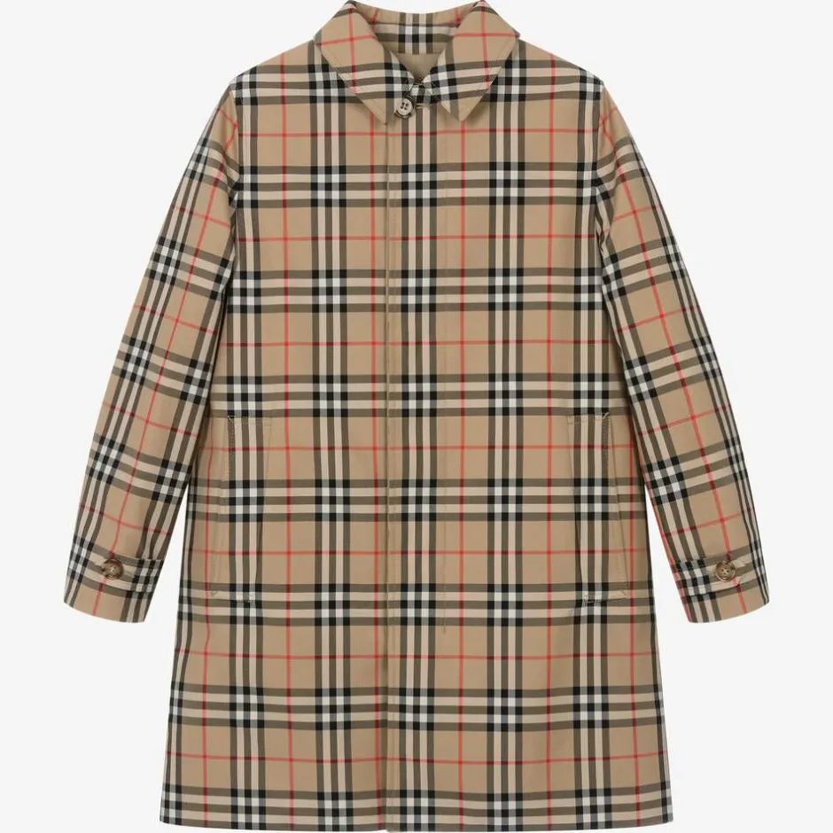 A reversible car coat for teen boys by luxury British fashion house Burberry, in the brand's signature archive beige. One side highlights the designer's distinctive Vintage check pattern in beige, black and red, whilst the other side is plain beige. Both sides have useful pockets and are trimmed with tortoise shell effect buttons on the cuffs and beneath the front placket. Woven in shower resistant gabardine, this trendy coat has a pointed collar, with a vented back for ease of movement.