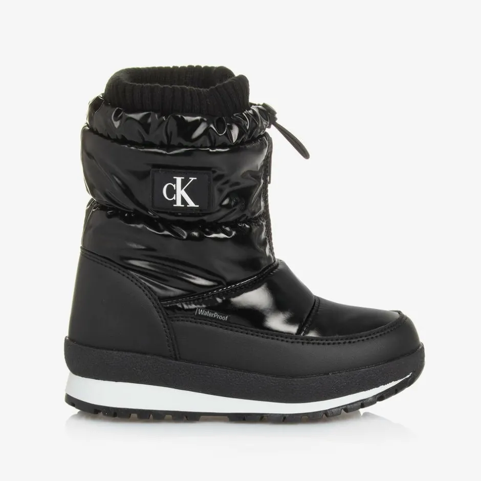From Calvin Klein, black faux leather trimmed textile snow boots for boys and girls. Waterproof and with a fleecy lining, they are comfortable and warm ideal for cooler weather. A zip fastening on the front makes dressing easy and the cuff can be tightened with a drawstring.