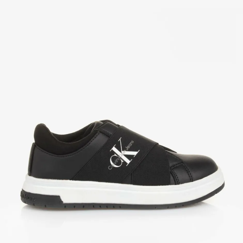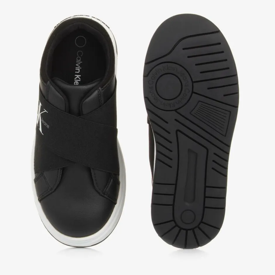 From Calvin Klein, black faux leather trainers for boys and girls. Styled with a smart finish, these comfortable trainers have elastic crossed over the foot for a secure fit. This product was made from at least 50% recycled polyester.