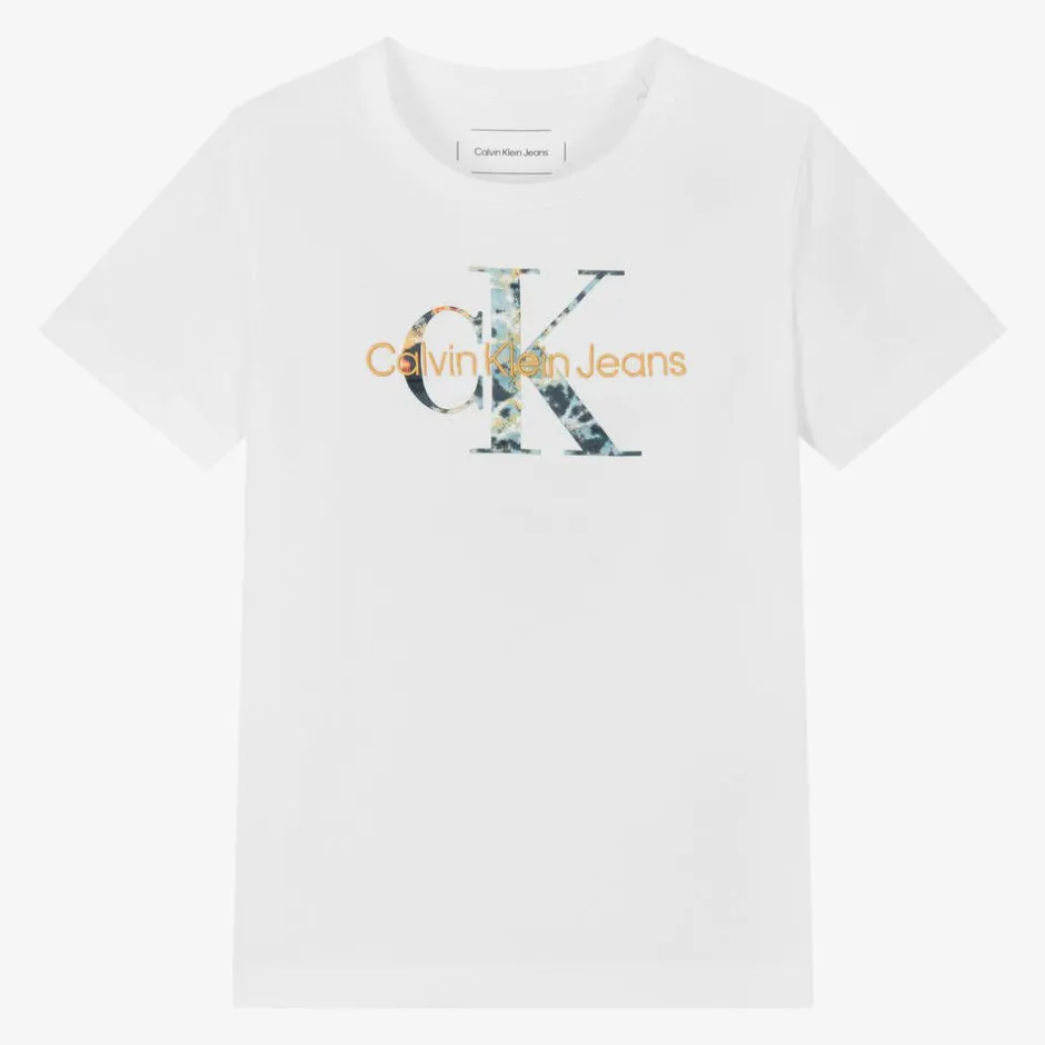 White short-sleeved T-shirt for boys by Calvin Klein, made in soft cotton jersey. Adding a stylish touch to this casual wardrobe staple, it has a mottled blue CK monogram print with a gold embroidered logo across the front.