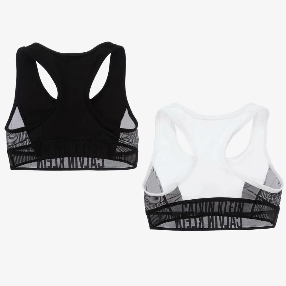 A two-pack of white and black bra top for girls by Calvin Klein, made from the softest cotton jersey. In a comfortable racer-back shape, these bras have sheer mesh inserts on the sides with a signature logo hemline for a cool look.