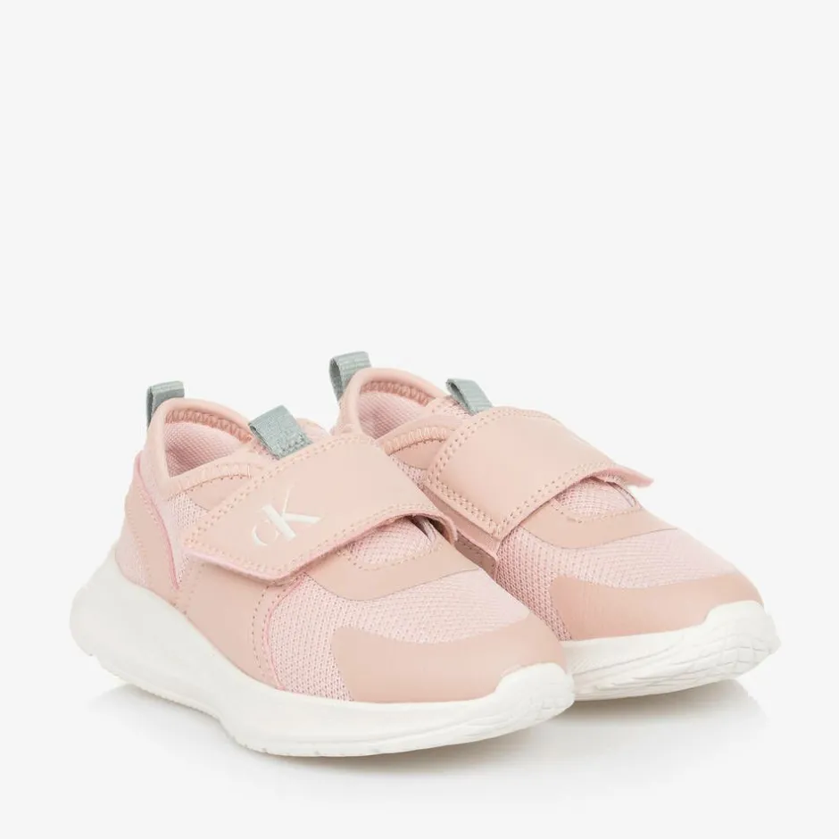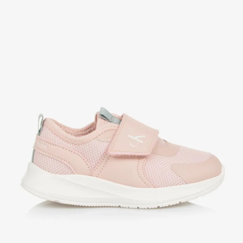 Pink trainers for girls by Calvin Klein, made in soft mesh with faux leather trims. They are lined in breathable mesh and fasten with a wide velcro strap across the foot. They have non-slip rubber outer soles and embossed white logos on the back of the heel and the strap for a subtle branded finish. This product contains at least 50% recycled fibres.