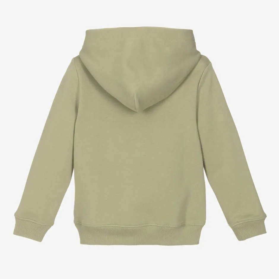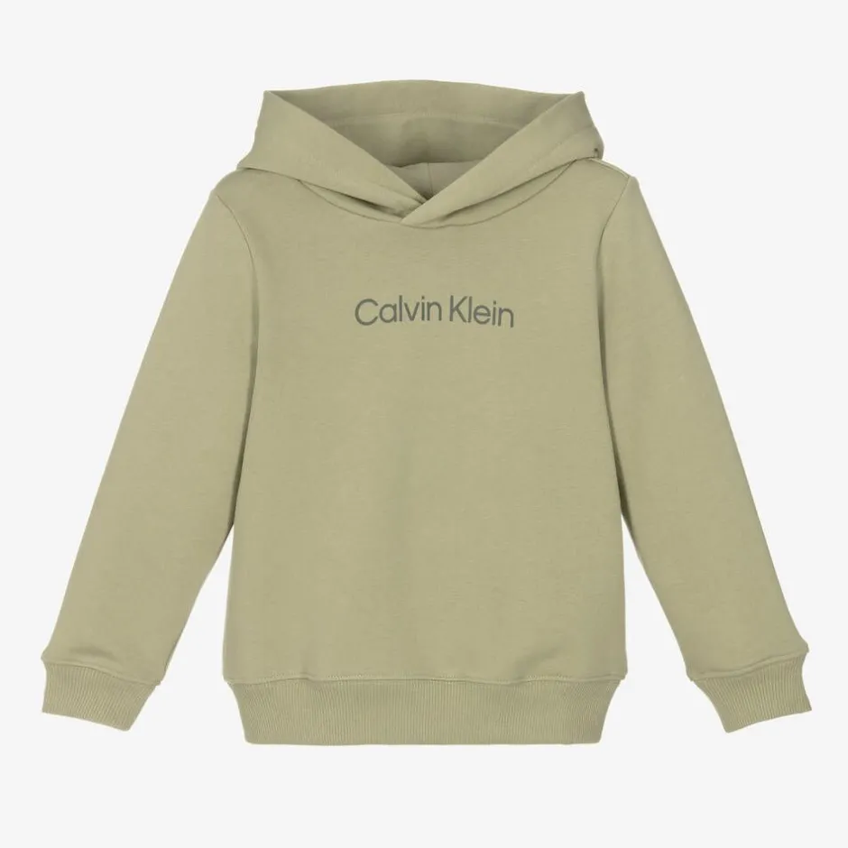 Casual green hooded sweatshirt for boys and girls from Calvin Klein. It is made in comfortable, mid-weight cotton jersey with a grey logo print across the front for instant branded appeal.