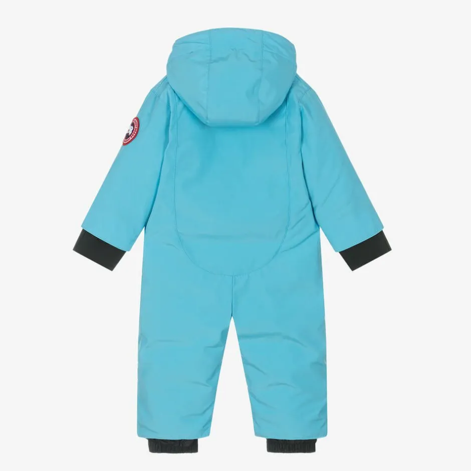 A blue hooded snowsuit for baby boys and girls from luxury outerwear brand Canada Goose, with the signature logo badge on one sleeve. Made from the brand's durable Arctic Tech technical fabric, it has water repellent qualities to keep warm and dry in extreme cold conditions. Luxuriously down padded, this cosy one-piece features a microfleece backing, heavy-duty, CORDURA reinforced sleeve cuffs which can fold over into mittens. The two front zip fastenings make dressing simpler, with a soft brushed trim on the wind guards for extra protection. The ankles have internal snow gaiters with branded elasticated cuffs for added grip around boots.
