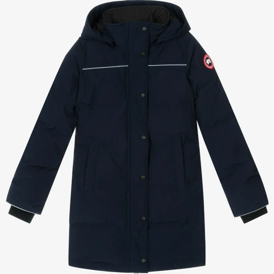 Navy blue Juniper parka coat for girls by luxury designer Canada Goose, made from durable nylon with water and wind resistant properties. Padded with down for ultimate warmth, this high-performance style is designed to stay warm and dry in extreme conditions and climates. The detachable hood has an extended peak to keep your child dry. Reflective piping features across the style, offering low-light visibility. It fastens with a zip on the front with a shielding popper-fastening placket, and the front pockets are fleece-lined, ideal for warming hands. The label's Gosling Graduate System allows the sleeves to be extended as your child grows. The coat can packed-away into the internal pocket and carried as a backpack or used as a travel pillow. The iconic disc logo, stamped on one sleeve, signs off the look.