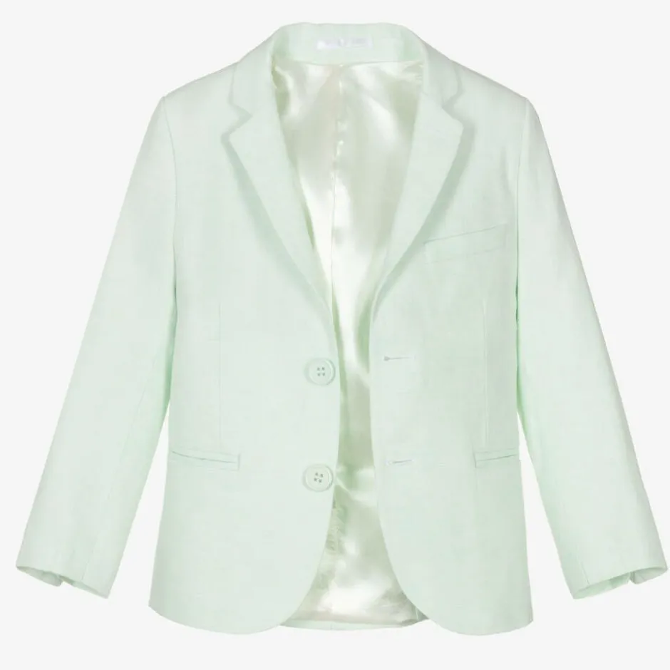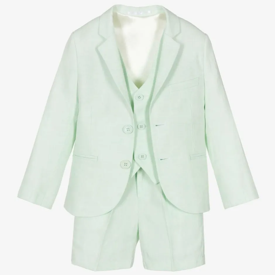 Charming three-piece pale green shorts suit for boys by Caramelo Kids, made in a linen and cotton blend in a subtle herringbone weave. This warm-weather smart set includes a tailored blazer, coordinating shorts and a matching waistcoat. The jacket fastens with buttons and is lined in silky satin. The shorts have a button and zip to fasten, with belt loops and an adjustable waistband. The waistcoat has a white silky satin backing with an adjustable buckle strap and buttons on the front to fasten.