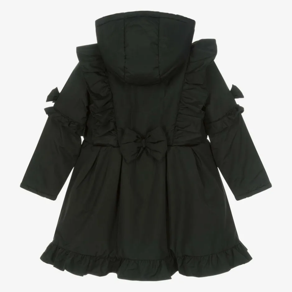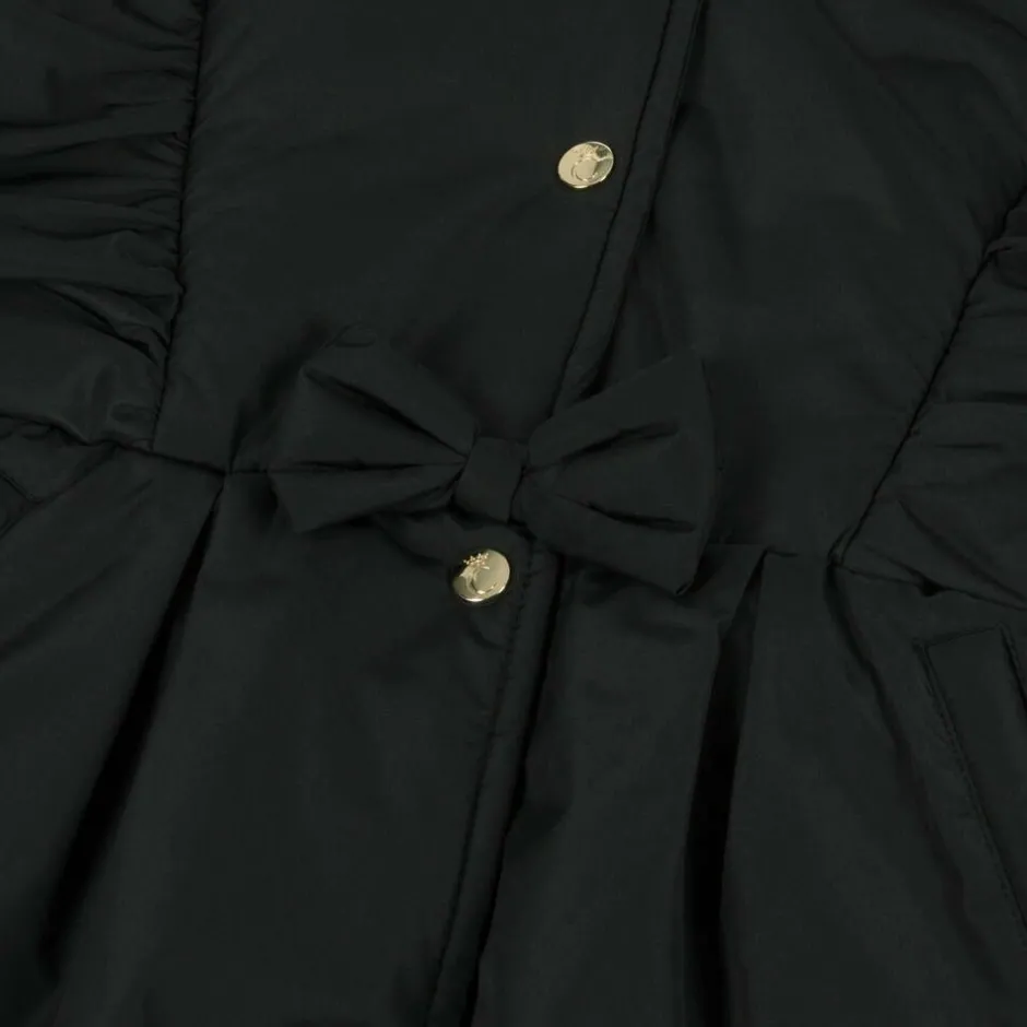 A black hooded coat for girls by Caramelo Kids. Lovely for the cooler weather, this smooth coat with mid-weight padding has a soft microfleece lining for added warmth and cosiness. Fastening with shiny gold logo-engraved poppers on the front, it has handy fleece-lined pockets and is decorated with tonal frills and appliqué bows. For a pretty fit and flare silhouette, it has a skirt-style overlayer with a ruffled hemline for added charm.