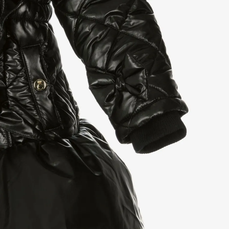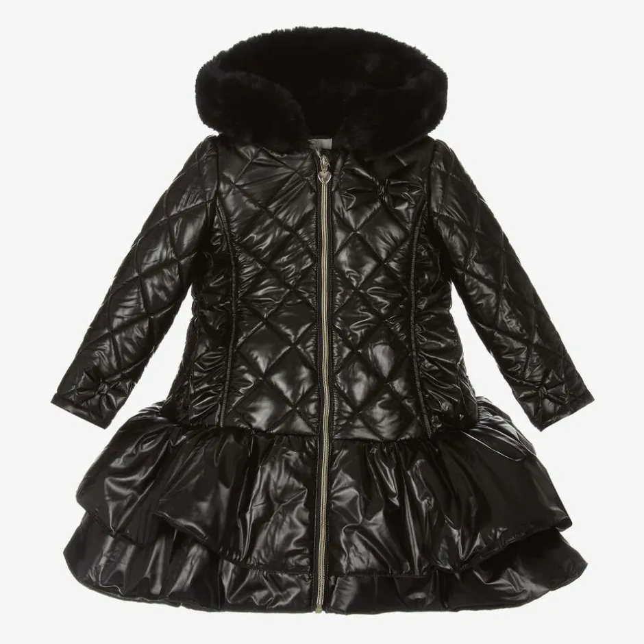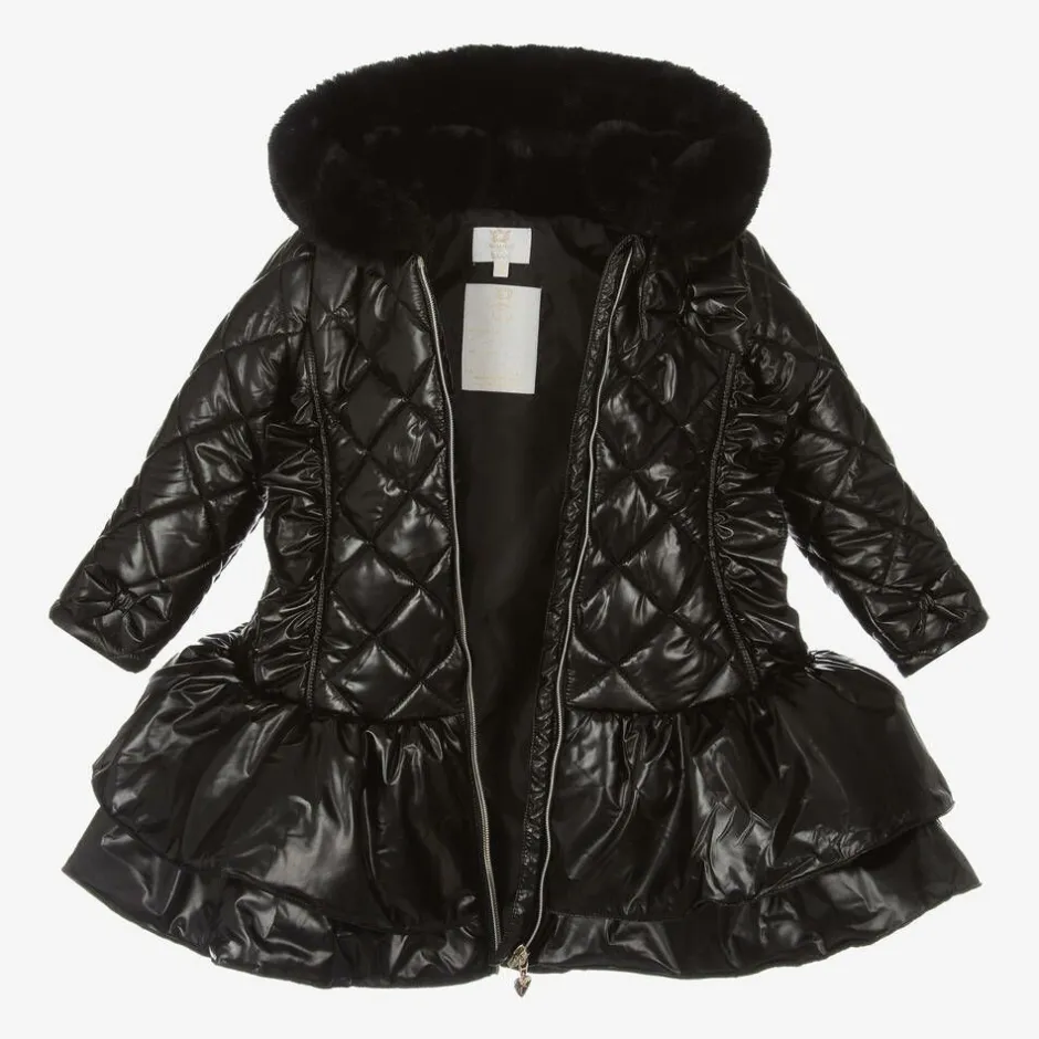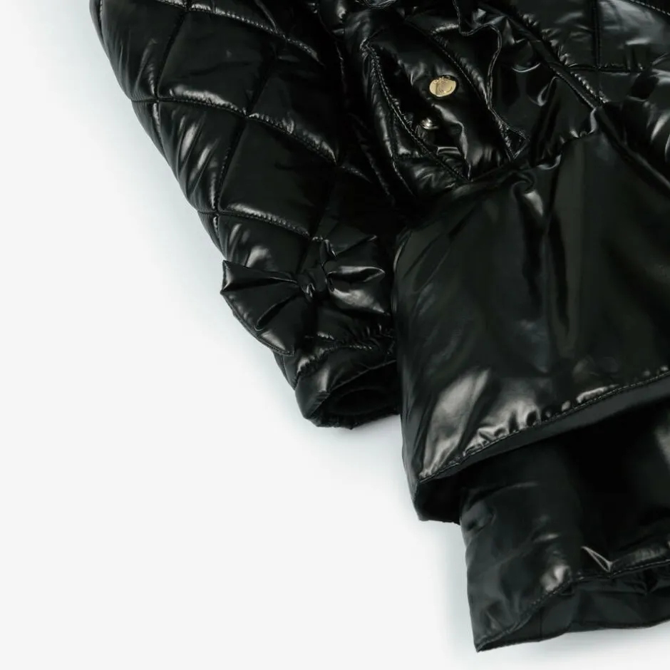 Designed with a metallic sheen, this gorgeous black coat for girls by Caramelo Kids, has a fixed hood with a cosy faux fur lining and trim. Made in a smooth, quilted fabric, it is styled with a layered, frilled hemline and a partially elasticated waistband for shape. It is trimmed with ruffles and decorative bows and features internal ribbed cuffs and useful pockets, which secure with gold-tone branded poppers. A gold zip fastening on the front completes the stylish look.